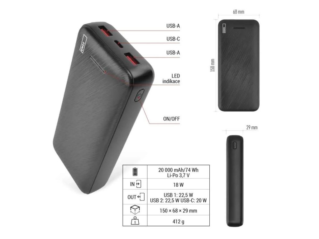 Powerbankă cu o capacitate de 20.000 mAh reprezintă o soluție fiabilă pentru încărcarea zilnică a dispozitivelor mobile acasă, la serviciu sau în deplasare. Datorită capacității mari, poate încărca de mai multe ori un smartphone, iar datorită dimensiunilor compacte din plastic ABS, este confortabil de ținut și ușor de transportat. Indicatorul LED permite verificarea rapidă a capacității rămase și a progresului încărcării.