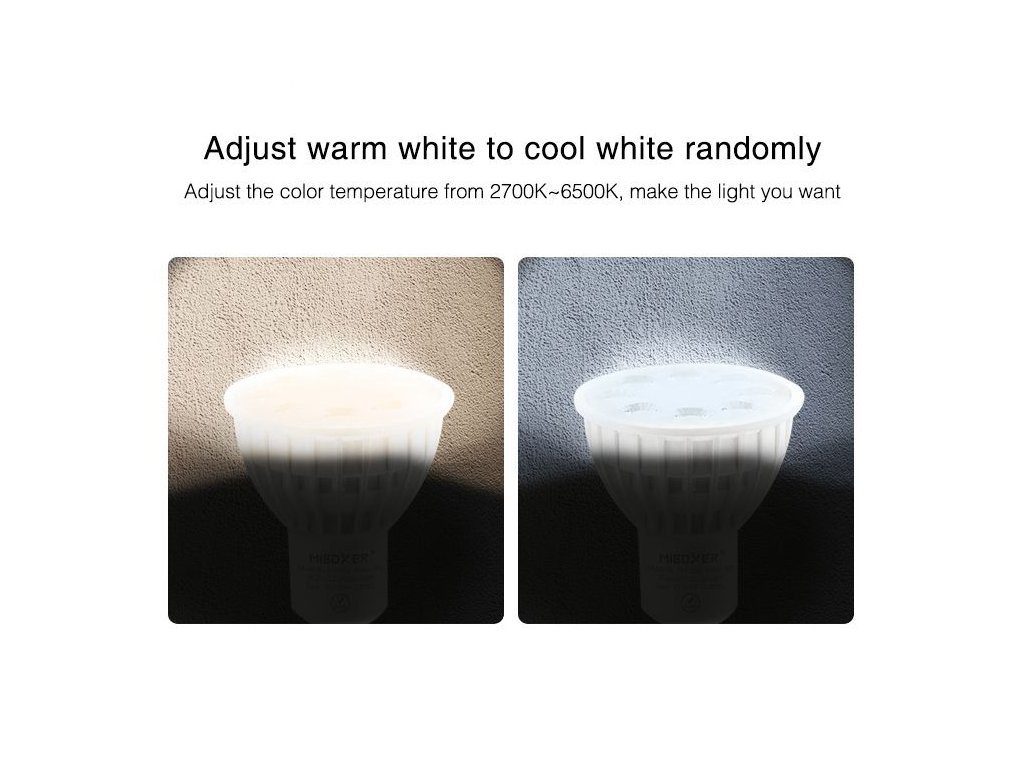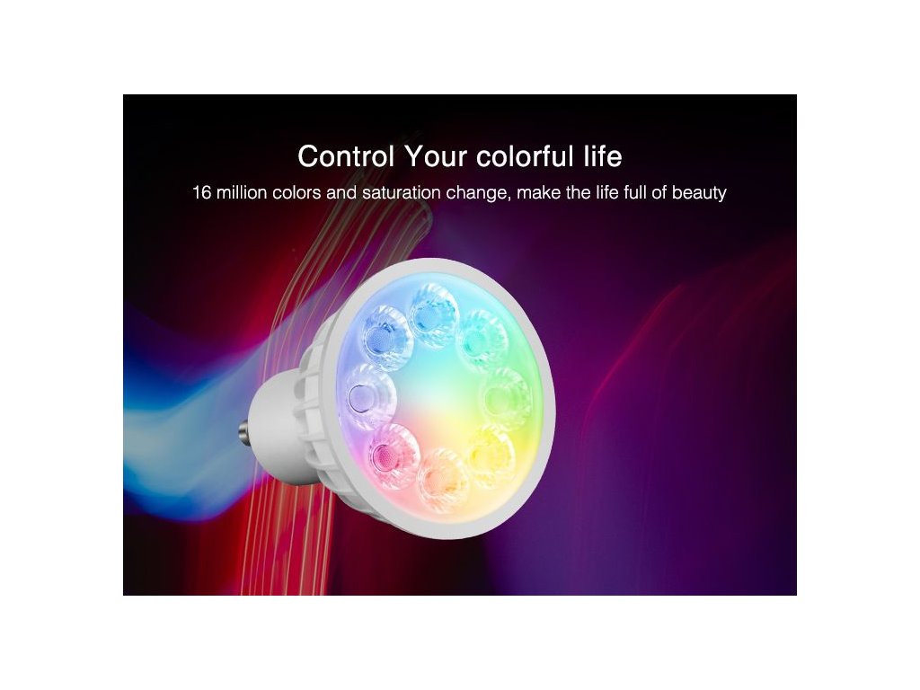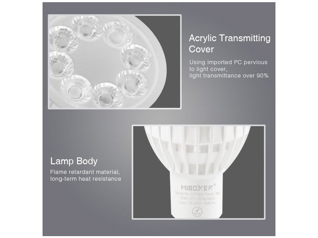 Becul LED de 4W cu un unghi îngust al fasciculului de 25° prezintă o combinație a două tehnologii RGB + CCT de la Mi-Light / MiBoxer. Datorită acestui lucru, becul poate străluci în până la 16 milioane de culori, iar luminozitatea și temperatura culorii pot fi ajustate.