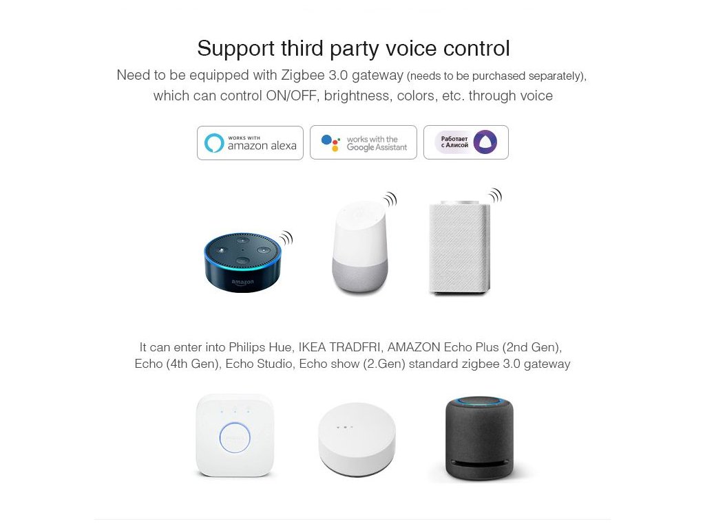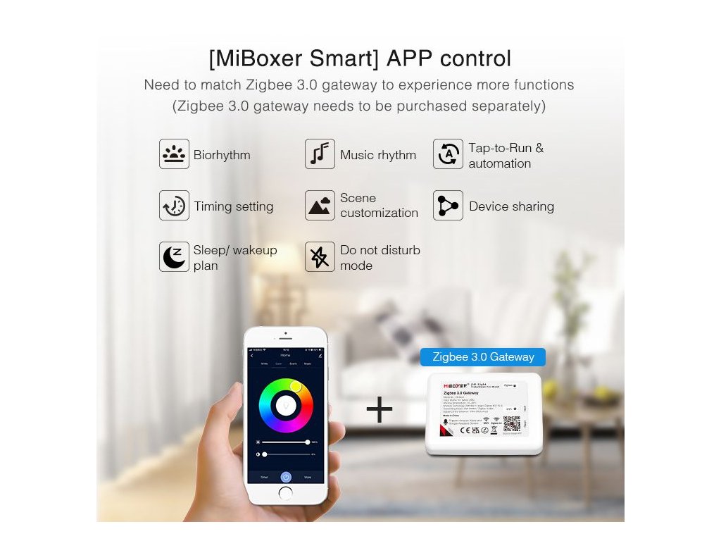 Pentru funcționarea corectă prin intermediul aplicațiilor de pe telefonul mobil sau tabletă trebuie achizitionat Mi-Light Gateway ZigBee ZB-Box1. Gateway-ul poate fi apoi asociat cu Amazon Alexa sau Google Assistant pentru a controla iluminatul folosind comenzi vocale.