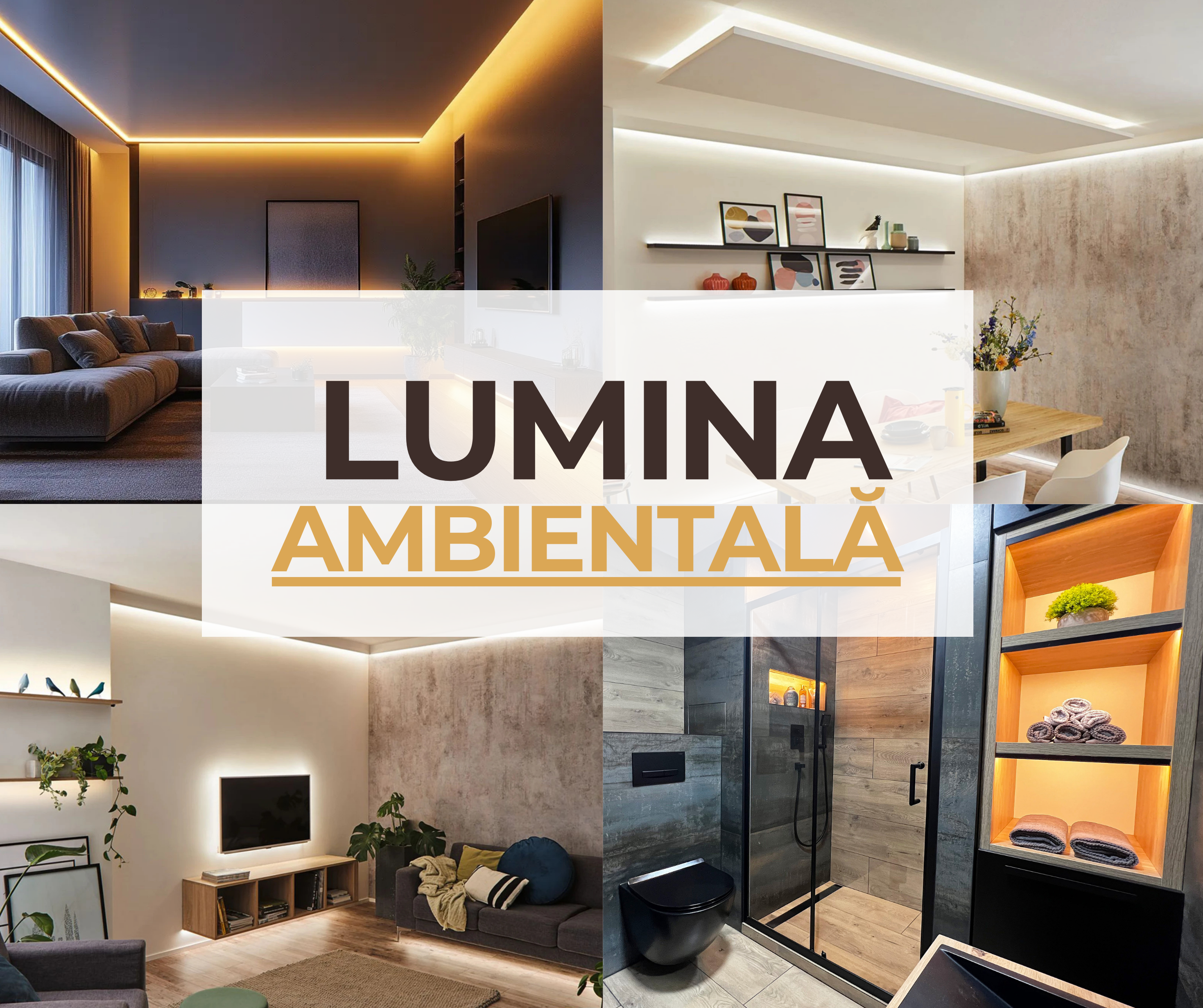 Iluminarea ambientală este o modalitate modernă de iluminare a spațiilor interioare, care creează o atmosferă plăcută și asigură o lumină uniformă în încăpere. Acest tip de iluminare este adesea realizat cu ajutorul benzii LED, amplasate în spatele televizoarelor, monitoarelor sau pe suprafețele de lucru. În acest fel, ia naștere efectul de iluminare indirectă, care nu doar contribuie la estetica încăperii, ci și reduce oboseala oculară, datorită unei lumini moi și difuze.