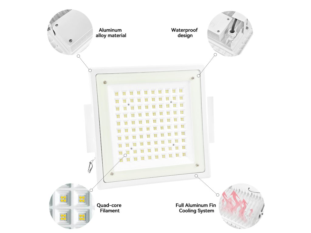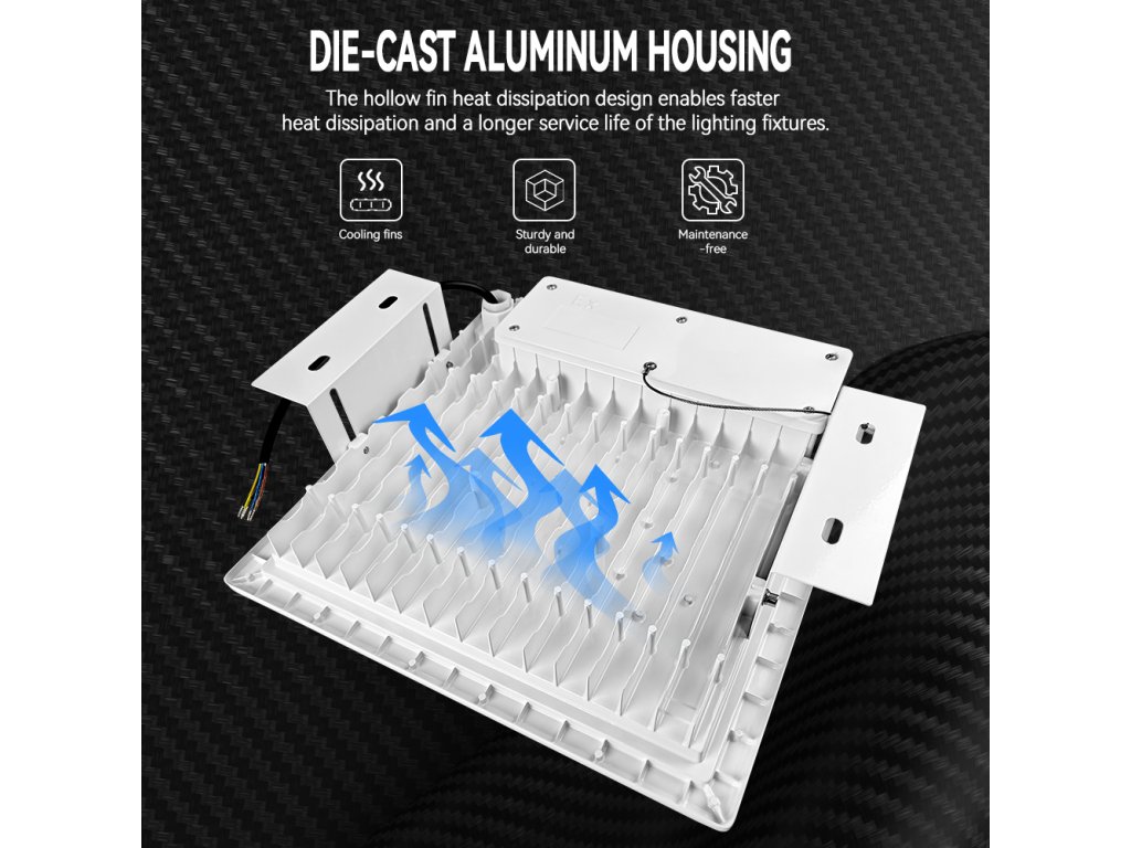 Construcția din aluminiu turnat sub presiune cu nervuri de răcire asigură o disipare fiabilă a căldurii și o durată de viață de până la 50 000 de ore. Protecția IP65 protejează corpul de iluminat împotriva ploii, a prafului și a intemperiilor, astfel încât este potrivit pentru funcționarea pe termen lung în exterior. Sticla de acoperire din material călit are o rezistență ridicată la presiune și impact și, în același timp, o transmisie excelentă a luminii.