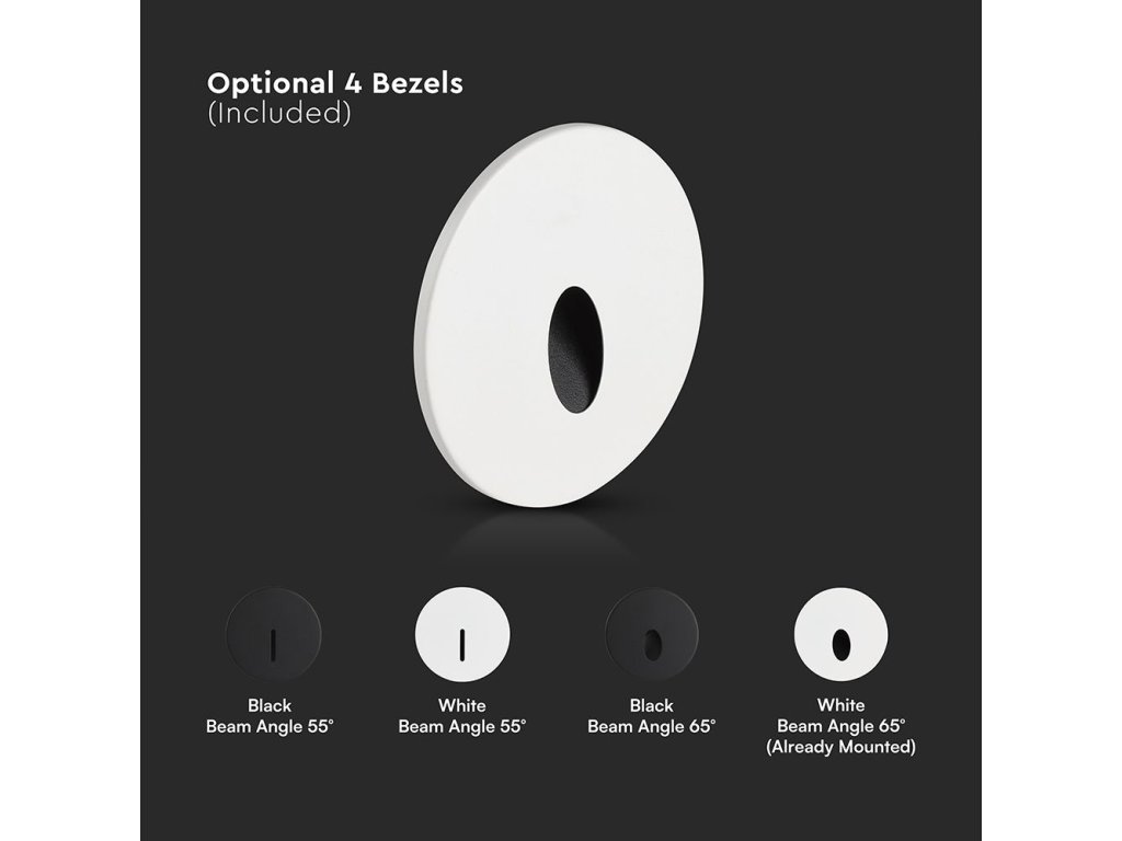 Pachetul include patru ramele interschimbabile, care permit adaptarea designului și a conului de lumină la proiectul specific – două albe și două negre, cu un unghi de fascicul îngust (55°) și unul mai larg (65°). Rezultatul este o soluție universală, pe care o puteți integra ușor în interior și exterior, obținând în același timp posibilitatea de a direcționa lumina după necesități.