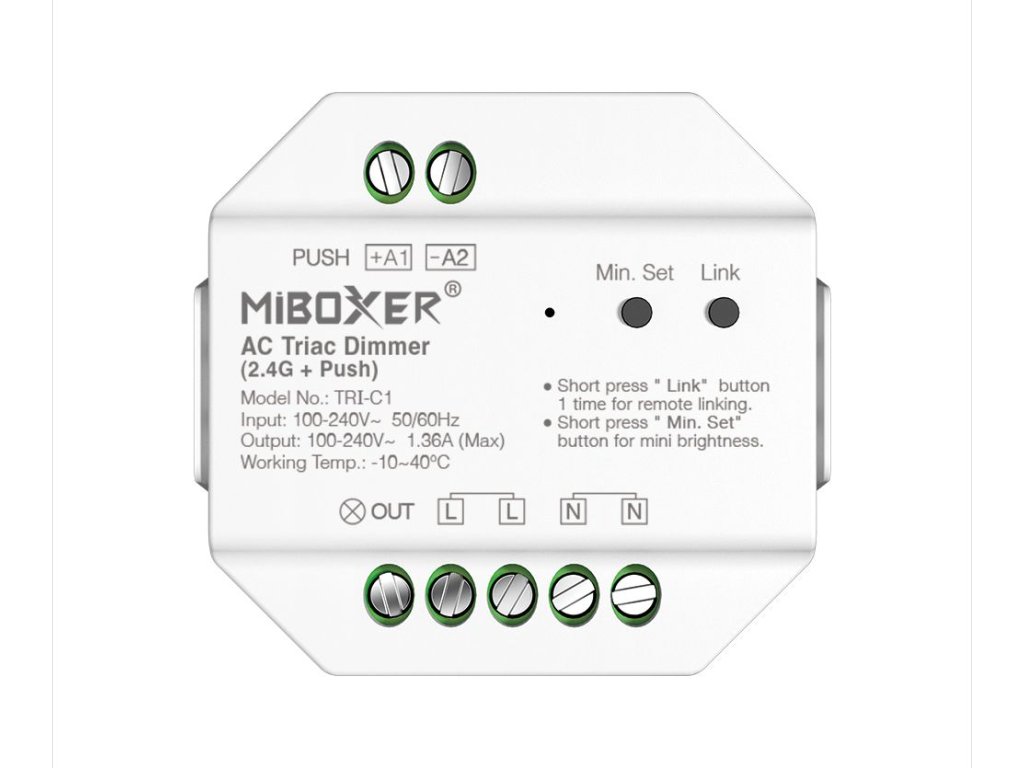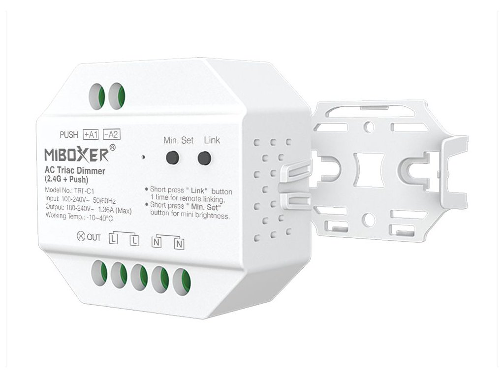 MiBoxer TRI-C1 este un variator inteligent pentru dimmerarea corpurilor de iluminat LED și cu halogen alimentate cu tensiune alternativă de 100–240 V. Permite controlul prin telecomandă RF, buton PUSH sau prin aplicația mobilă Tuya – pentru această funcție, totuși, este necesar să achiziționați o poartă MiBoxer de 2,4 GHz, care conectează variatorul la aplicație și la asistenții vocali.
