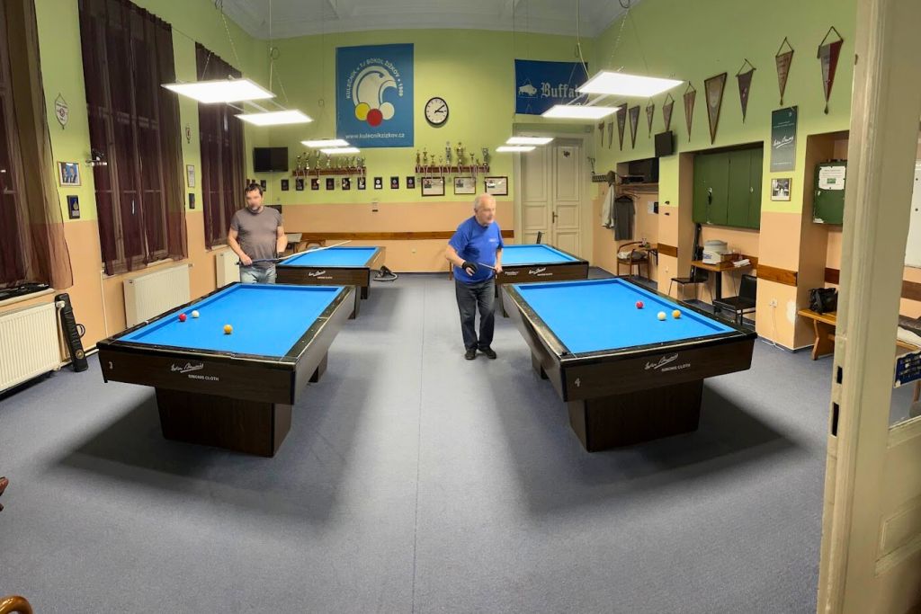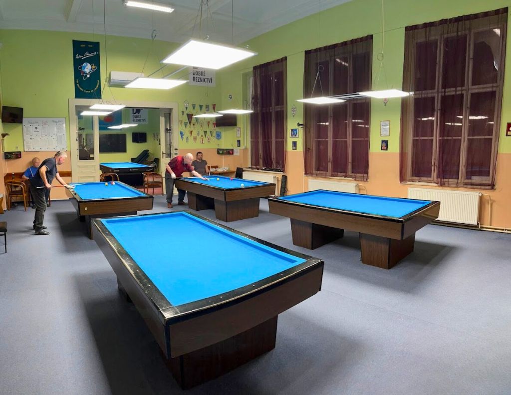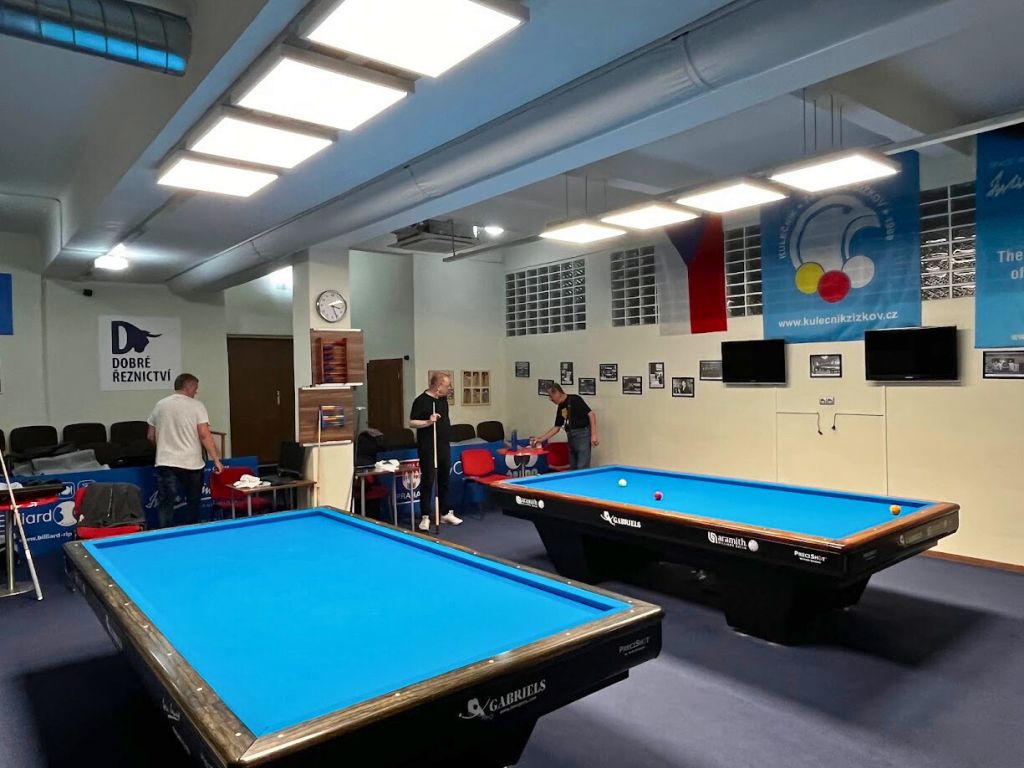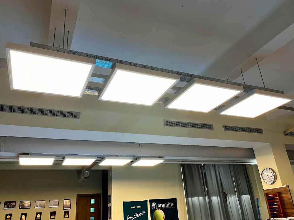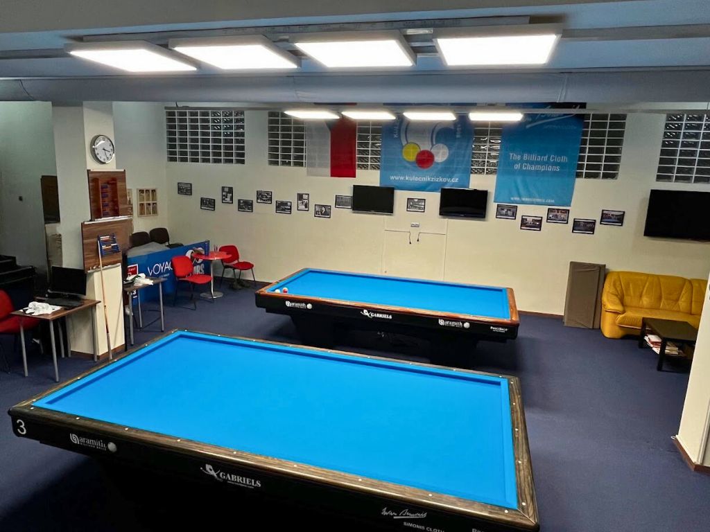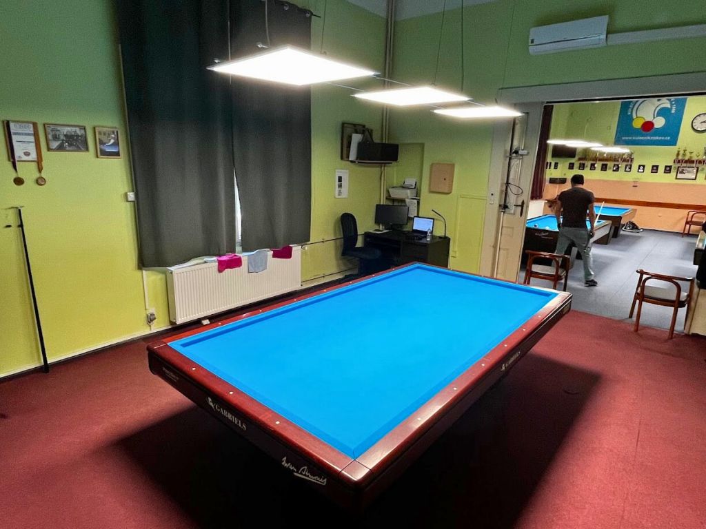 În clubul de biliard ne-am ocupat de modernizarea completă a iluminatului în toate cele trei săli de joc. Tuburile LED originale cu lumină rece (6500 K) au fost înlocuite cu o combinație de panouri LED suspendate și aplicate de tip UGR. Aceste panouri au un difuzor microprismatic care asigură o distribuție perfectă a luminii și elimină orbirea neplăcută – exact ceea ce au nevoie jucătorii profesioniști în timpul jocului. Noul sistem de iluminat cu temperatura de 4500 K oferă o lumină mai plăcută și naturală, care în același timp respectă nivelul luminos necesar de 750 lx, confirmat prin calcul fotometric.