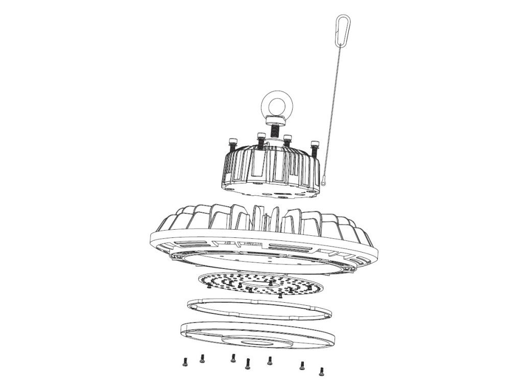 Corpul de iluminat cu o putere de 150 W atinge un flux luminos de 22 500 lm, ceea ce corespunde unei eficiențe ridicate de 150 lm/W. Este echipat cu cipuri LED de înaltă calitate SMD2835 Lumileds, care se caracterizează prin luminozitate ridicată, funcționare stabilă și o durată de viață lungă de până la 50 000 de ore. Corpul masiv din aluminiu turnat sub presiune asigură o disipare eficientă a căldurii și prelungește durata de viață a întregului corp de iluminat.