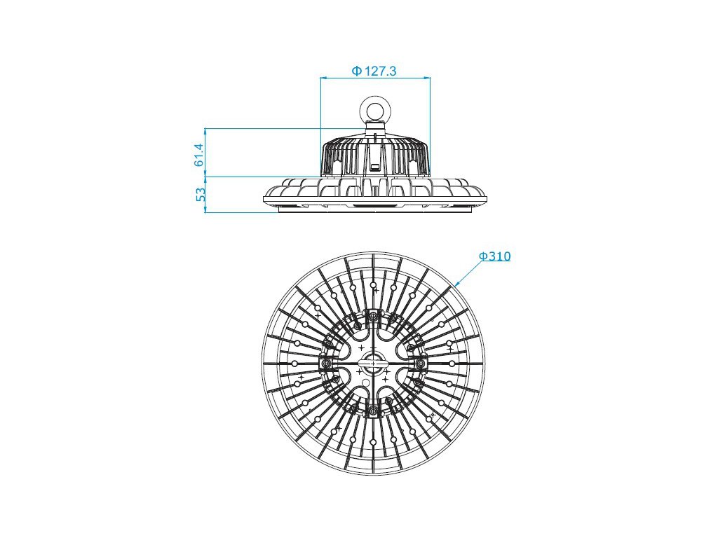 Corpul de iluminat suspendat cu LED de tip UFO High-bay este proiectat pentru iluminarea spațiilor cu tavane înalte, cum ar fi halele de producție, depozitele, atelierele, locurile de sport sau spațiile comerciale. Datorită protecției IP65, este rezistent la umiditate și praf, astfel încât funcționează fiabil chiar și în medii dificile.