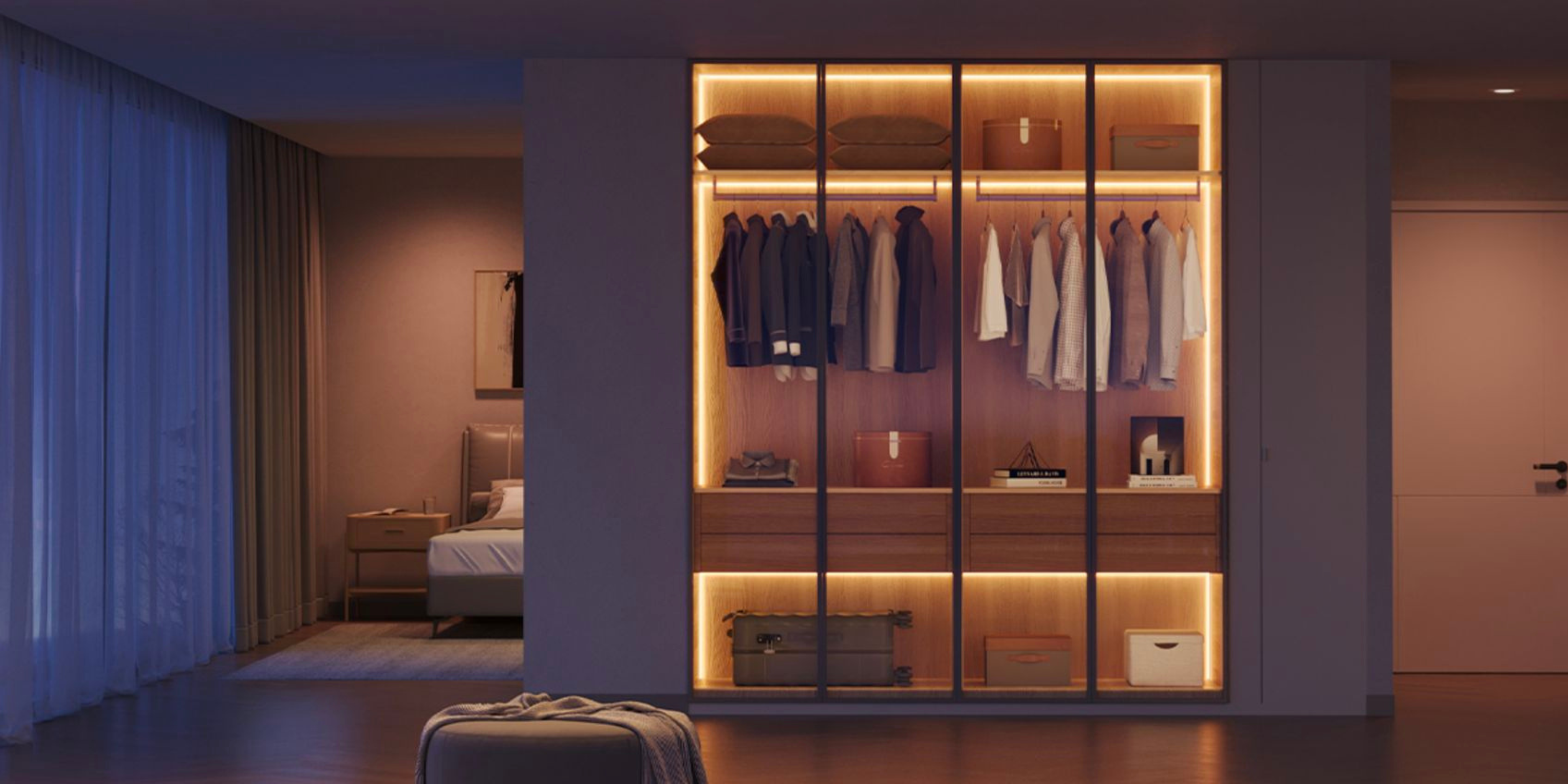 În cazul dulapurilor, recomandăm utilizarea unui sistem cu bandă LED + sursă + profil + senzor, cu activare prin mișcarea mâinii sau la deschiderea și închiderea ușilor dulapului.