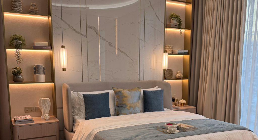 Corpurile de iluminat dimabile sau aplice de perete cu lumină indirectă, accentuează caracterul calm al dormitorului și contribuie la confortul vizual general.