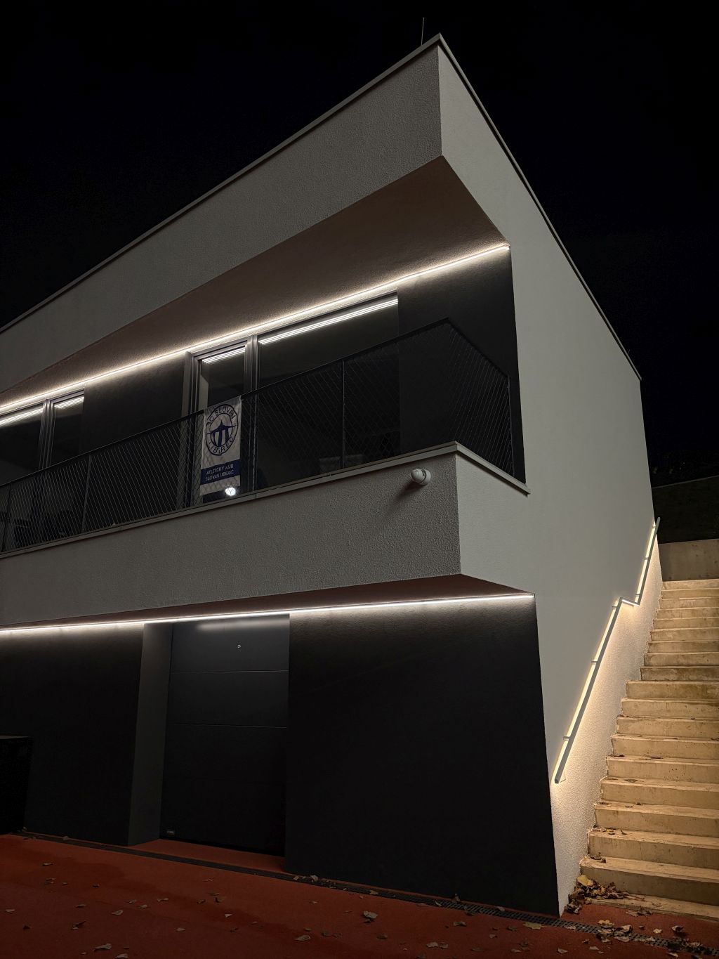 Am folosit o combinație de panouri LED economice și corpuri de iluminat industriale, capabile să reziste ritmului intens de antrenamente și nivelului ridicat de umiditate din zonele interioare. Pentru iluminatul exterior al clădirii am instalat benzi LED cu grad de protecție ridicat, care oferă stadionului un aspect modern și elegant pe timp de seară.