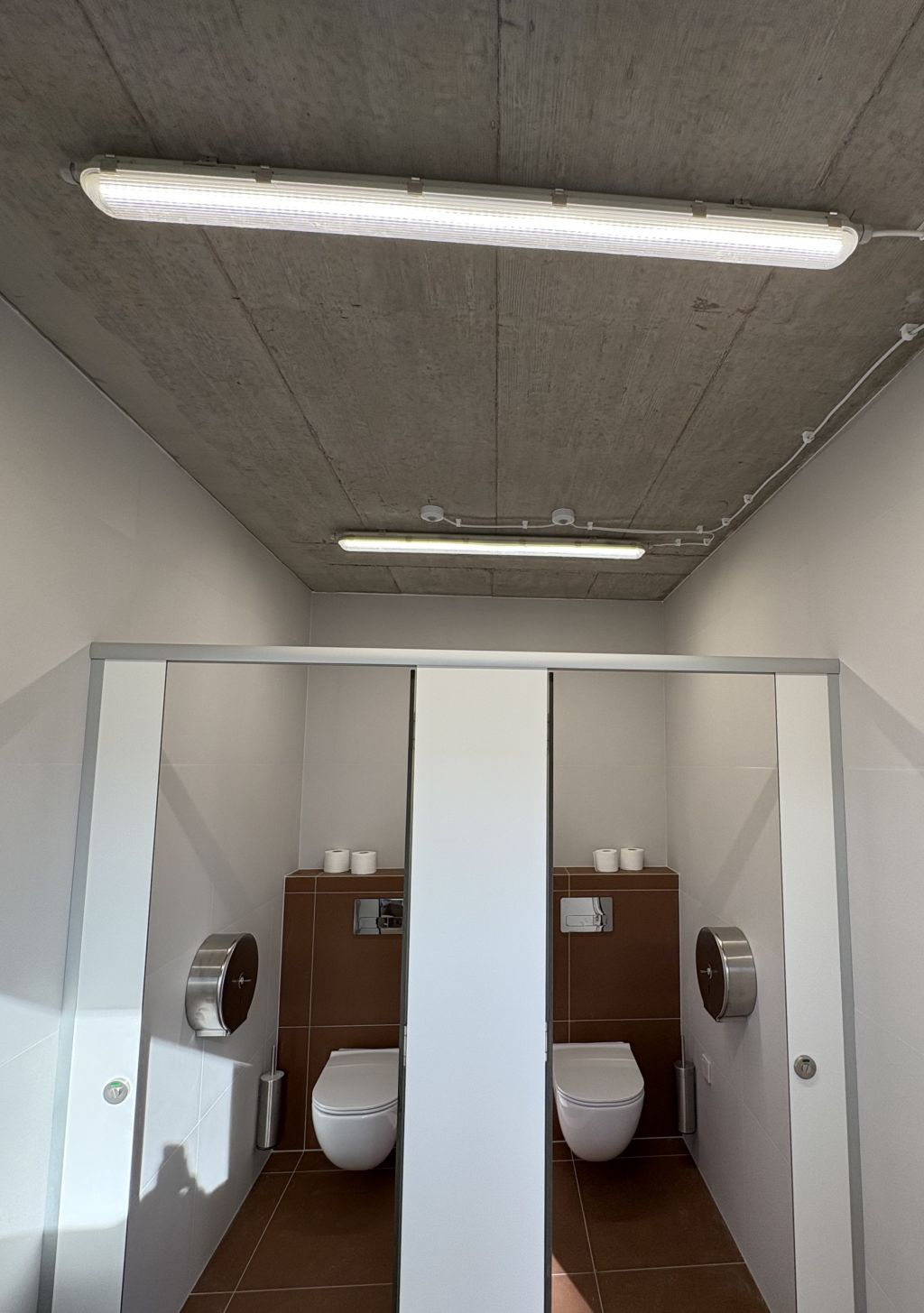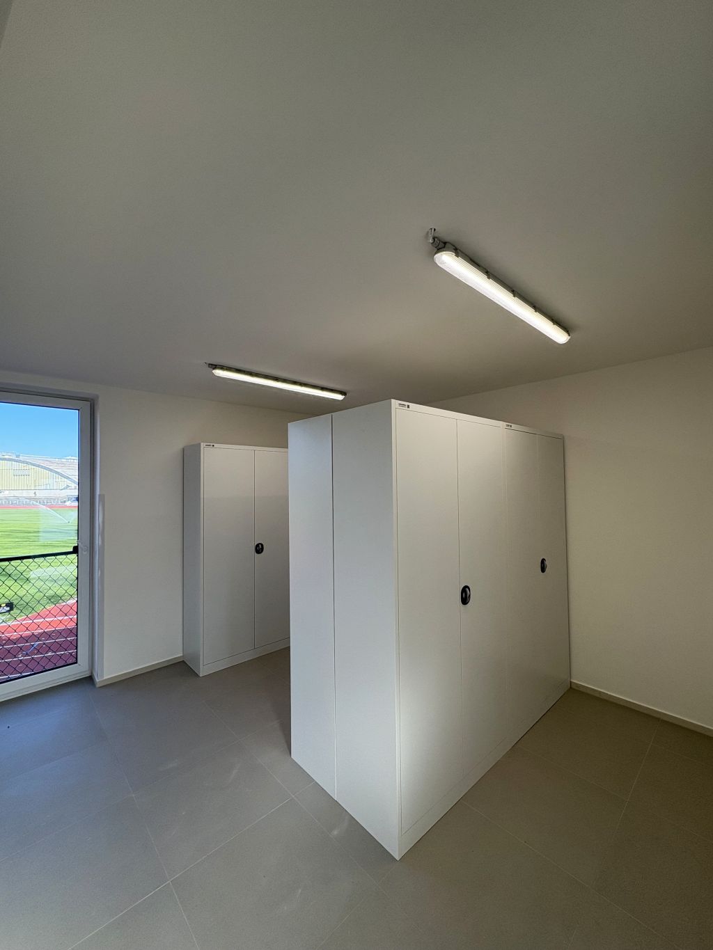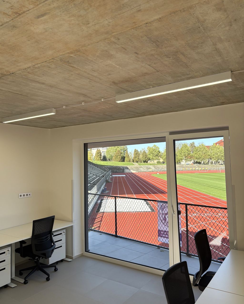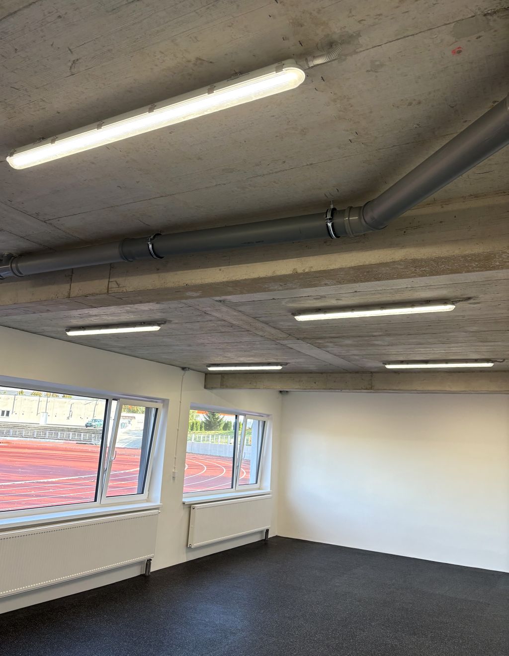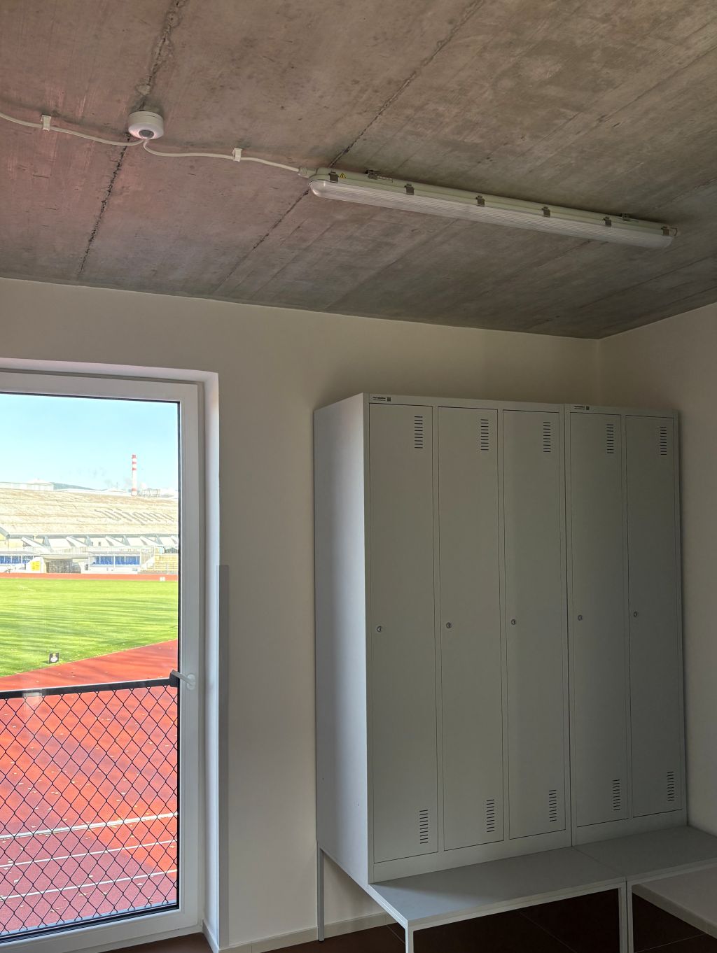 Pe stadionul de atletism ne-am ocupat de iluminarea completă a noilor spații auxiliare. Pentru că sportivii trebuie să vadă bine nu doar pe pistă, ci și în geantă din vestiar, am realizat iluminat LED modern pentru toate încăperile – de la vestiare, dușuri și sala de forță până la iluminatul exterior al clădirii.
