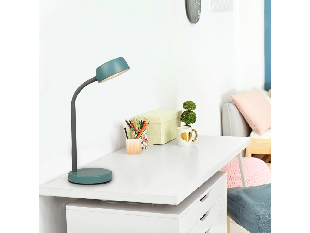 Lampa de birou LED albastră elegantă Berry cu o putere de 4,5 W este o alegere excelentă pentru birou, camera copiilor și biroul de acasă. Oferă suficientă lumină pentru citit, scris sau lucrat pe laptop și, datorită culorii albe diurne a luminii, cu o temperatură de 4000 K, susține concentrarea și menține o atmosferă naturală în cameră.