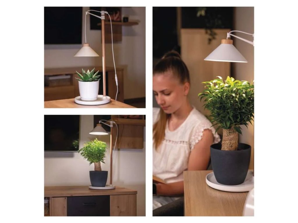 Datorită combinației dintre finisajul metalic alb și elementul de lemn, lampa de cultivare arată ca un accesoriu elegant pentru interior. Se potrivește excelent în camere de zi, birouri, spații de lucru, recepții sau cafenele, unde, pe lângă susținerea creșterii plantelor, îndeplinește și o funcție decorativă, integrându-se natural în spațiul modern.