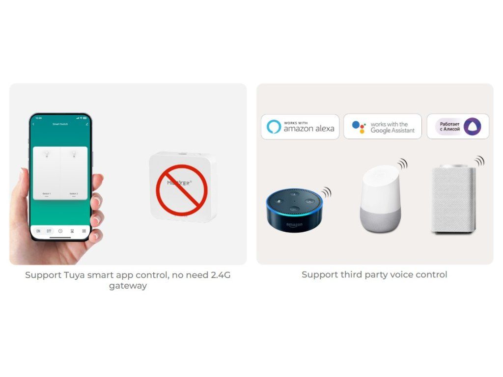 Controlul este posibil direct prin butoanele de pe panou, cu ajutorul telecomenzii RF sau prin aplicația mobilă Tuya. Datorită conexiunii WiFi integrate, nu este necesară nicio poartă de acces pentru controlul prin aplicație sau pentru asistenții vocali.