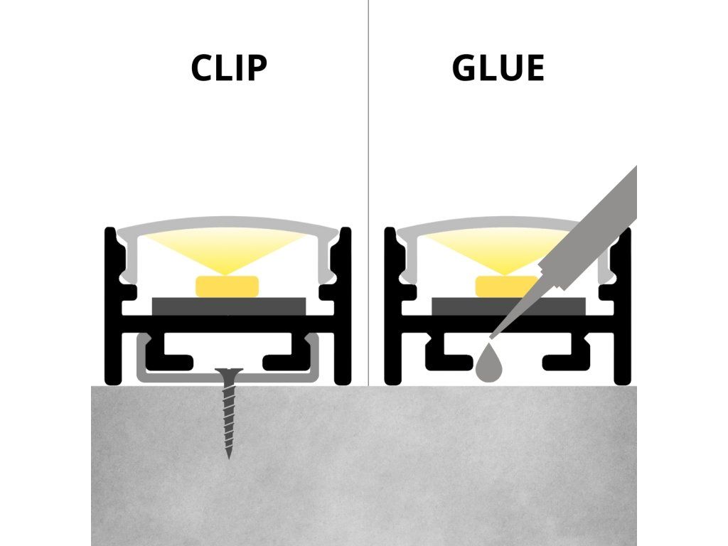 Profilul este livrat fără difuzor sau cu un difuzor cu clic, care asigură o dispersie uniformă a luminii și, în același timp, protejează banda LED împotriva prafului și a deteriorărilor mecanice. Există variante transparente, mate sau negre, în funcție de efectul de iluminare dorit.