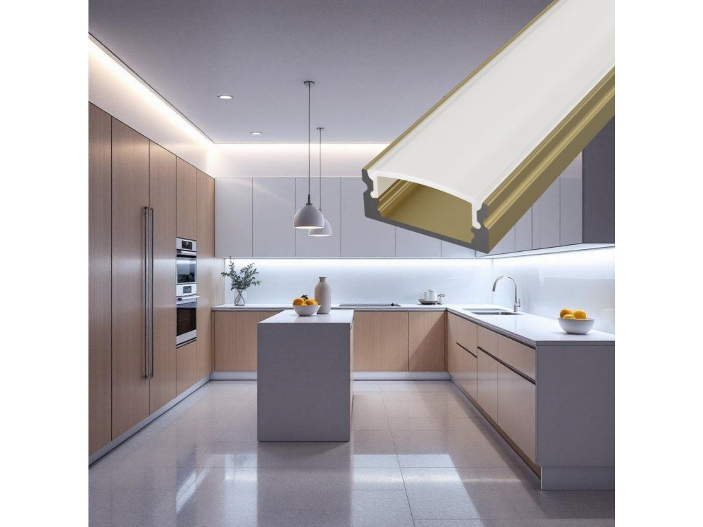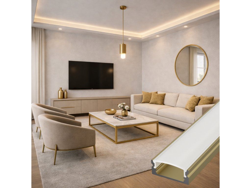 Profilul de perete din aluminiu, într-o elegantă nuanță champagne, servește ca radiator pentru banda LED și, în același timp, ca element de design, potrivit pentru interioare moderne și luxoase. Nuanța metalică subtilă pare curată și atemporală, potrivindu-se bine cu materiale deschise la culoare, sticlă sau detalii metalice.