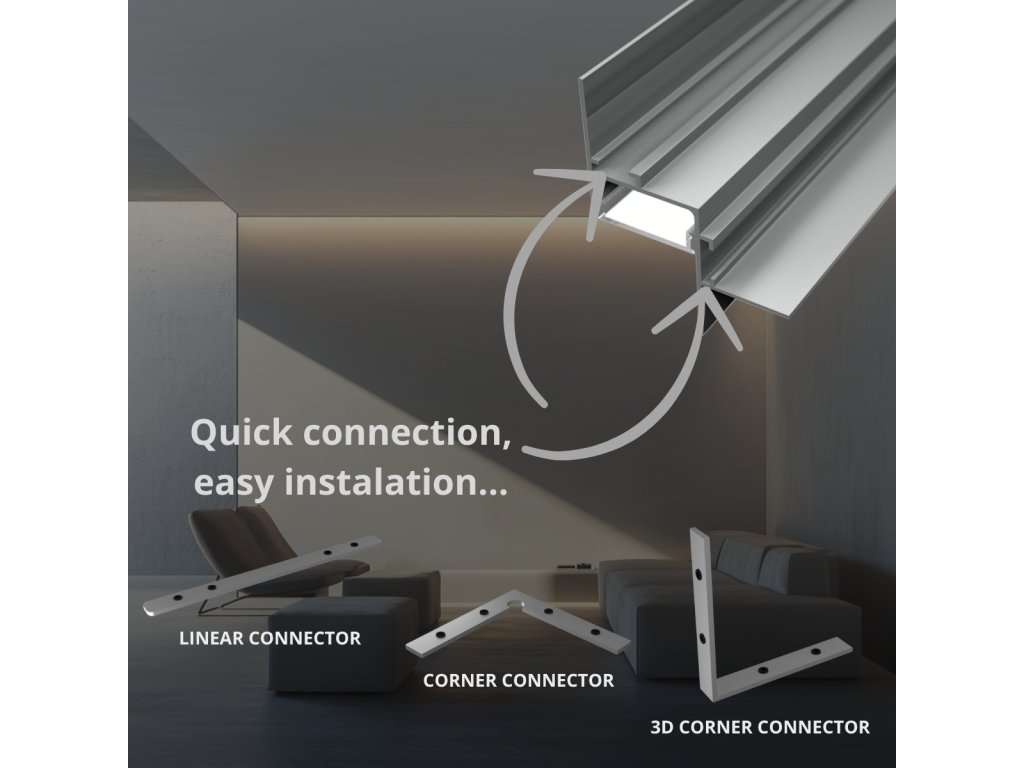 Acest profil sau bandă de aluminiu încorporat servește nu numai ca radiator pentru banda LED, ci și ca element de design pentru casa dvs. sau ca accesoriu de mobilier. Profilul este proiectat pentru instalare încastrată pentru a oferi un aspect modern și curat interiorului.