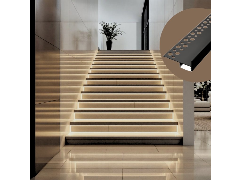 Un profil elegant din aluminiu pentru scări, conceput pentru montare sub plăci ceramice, este special proiectat pentru a crea o margine curată și funcțională a scării și, în același timp, pentru a permite instalarea unei benzi LED pentru o iluminare de fundal eficientă și sigură. Datorită acestei soluții, lumina devine o parte naturală a structurii scării și creează o impresie modernă și discretă. Profilul este potrivit pentru utilizare în interioare rezidențiale, spații comerciale și hoteluri, unde se pune accent pe estetică și siguranță.