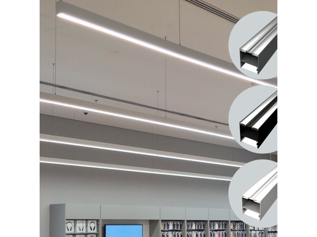 Profilul este ideal pentru crearea unei iluminări suspendate elegante folosind seturi de suspensie de 1,5 metri. Aceste seturi sunt disponibile în trei variante de culoare – argintiu, negru și alb – ceea ce facilitează asortarea lor cu designul interior. Prin suspendarea profilului cu ajutorul acestor seturi, veți obține un corp de iluminat liniar modern, cu efect „plutitor”, ideal pentru birouri, showroom-uri, bucătării și sufragerii. Această metodă de montare permite reglarea flexibilă a înălțimii și asigură un aspect curat și profesional al iluminatului.