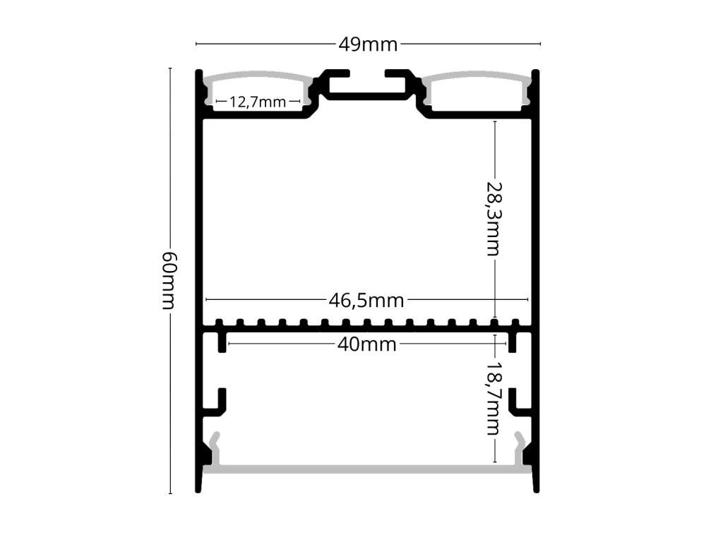 Partea inferioară oferă spațiu pentru 1 până la 3 benzi LED una lângă alta, ceea ce asigură o putere luminoasă ridicată în jos. Cele două canale superioare separate sunt destinate benzilor LED suplimentare, care creează o iluminare indirectă fină a tavanului.