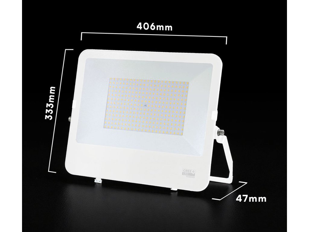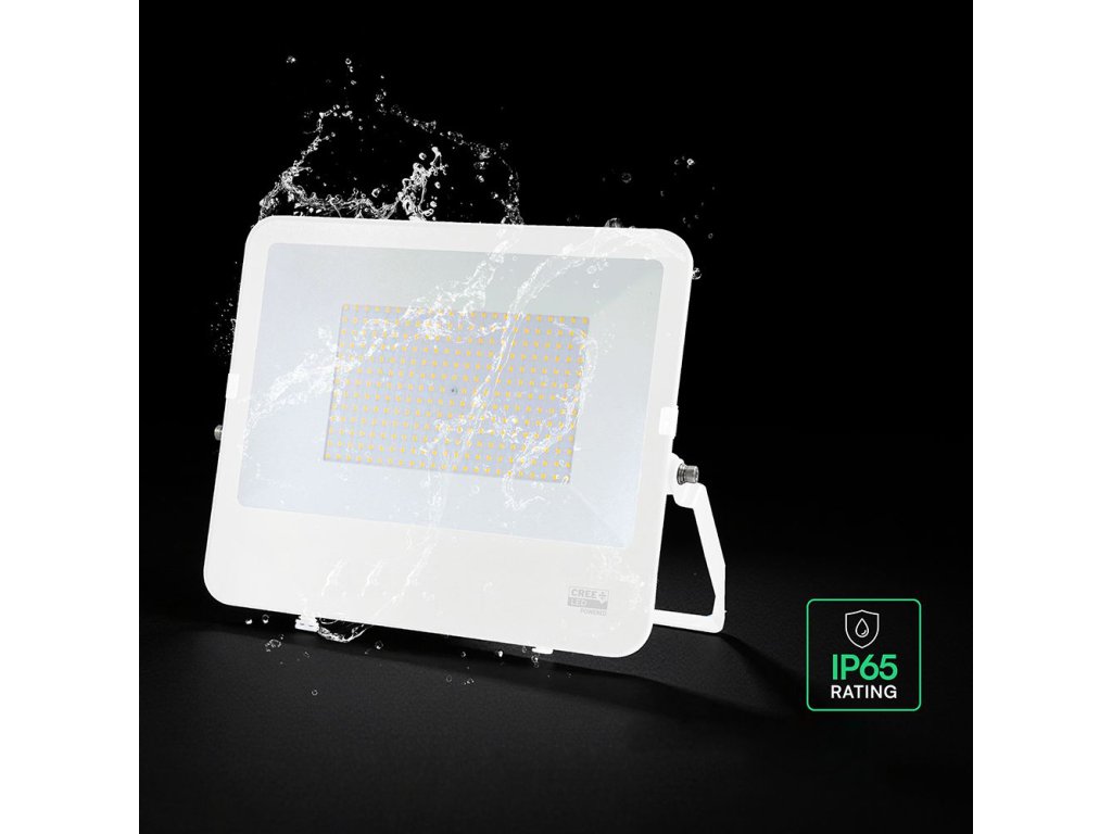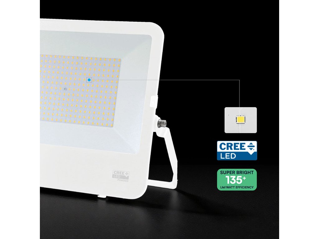 Corpul robust din aluminiu premium, de culoare albă, cu disipare modernă a căldurii, garantează o durată de viață lungă de până la 30.000 de ore și o funcționare stabilă chiar și în condiții dificile. Finisajul rezistent la coroziune și clasa de protecție IP65 protejează reflectorul împotriva prafului, ploii și umidității, fiind astfel o alegere ideală pentru fațadele clădirilor, zone industriale, terenuri sportive, parcări, zone publicitare sau spații comerciale. Sticla mată frontală asigură o dispersie uniformă a luminii și reduce strălucirea nedorită.