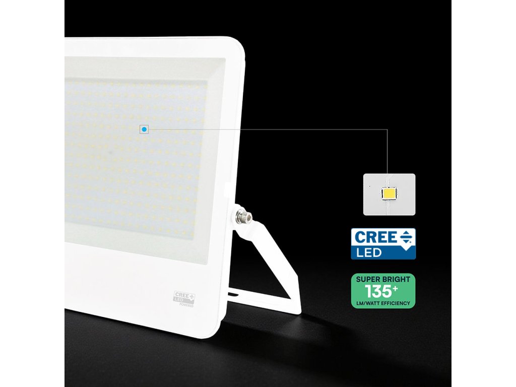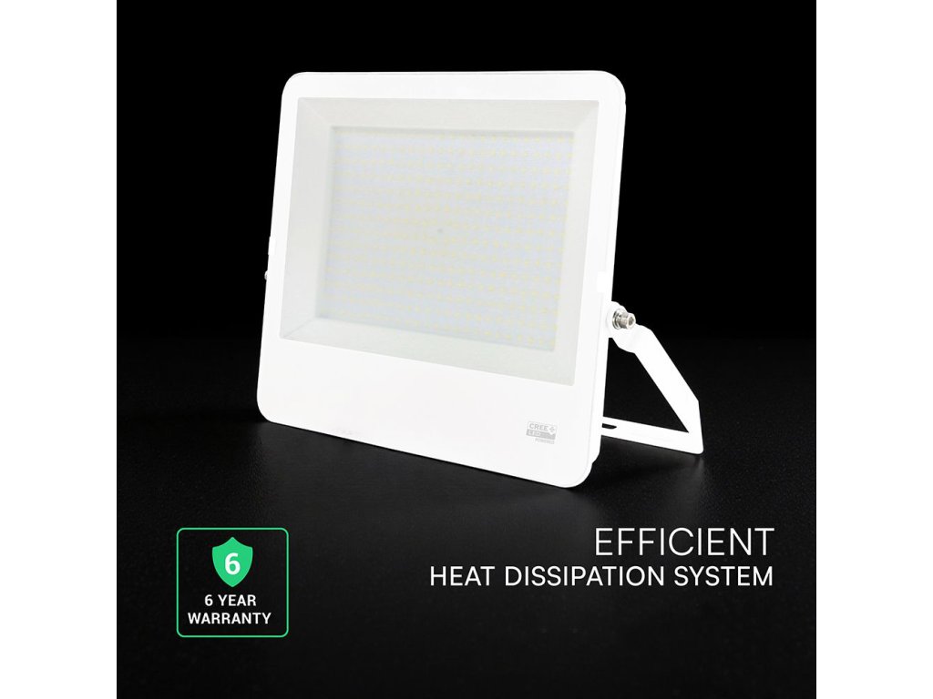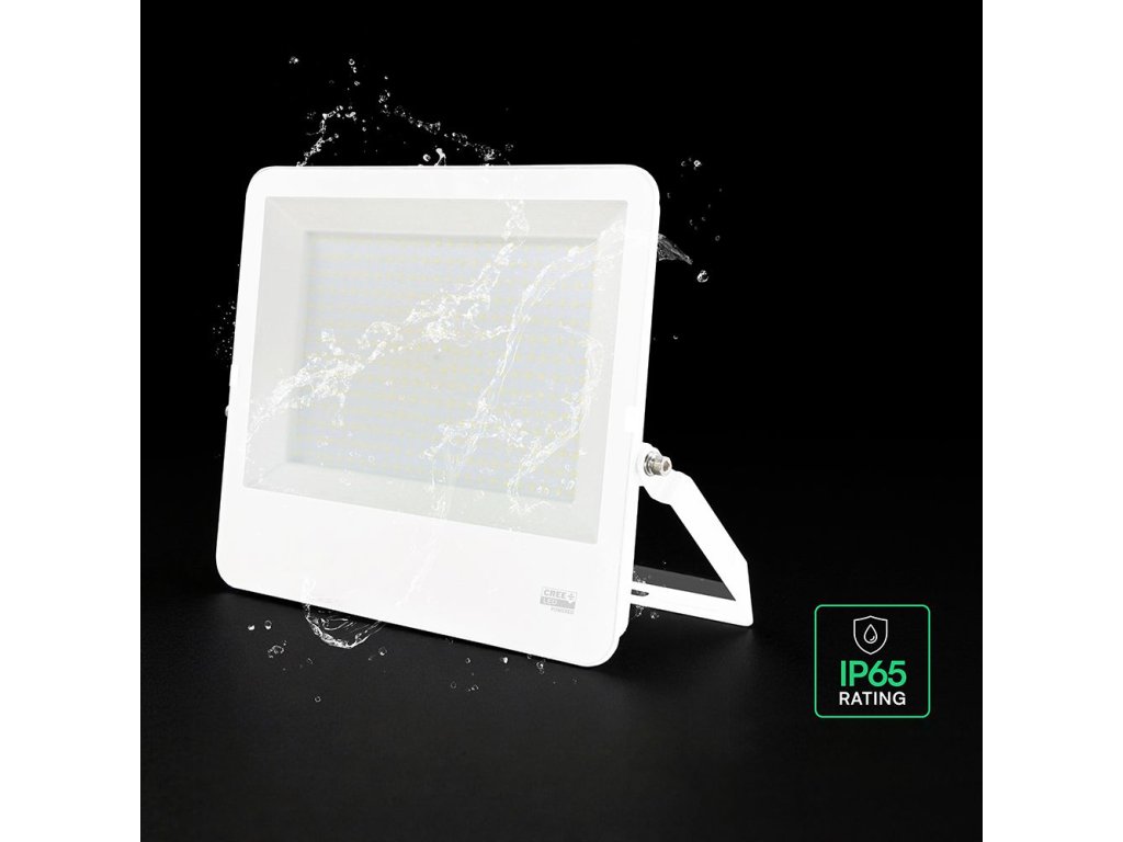 Corpul robust din aluminiu premium, de culoare albă, cu disipare modernă a căldurii, garantează o durată de viață lungă de până la 30.000 de ore și o funcționare stabilă chiar și în condiții dificile. Finisajul rezistent la coroziune și clasa de protecție IP65 protejează reflectorul împotriva prafului, ploii și umidității, fiind astfel o alegere ideală pentru fațadele clădirilor, zone industriale, terenuri sportive, parcări, zone publicitare sau spații comerciale. Sticla mată frontală asigură o dispersie uniformă a luminii și reduce strălucirea nedorită.
