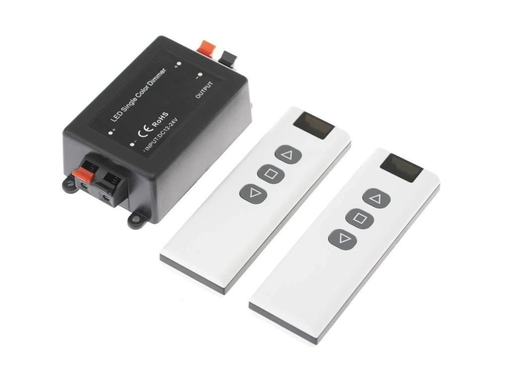 Dimmer cu un singur canal pentru controlul luminozității benzilor LED 12 - 24V cu driver cu frecvență radio. Dimmerul reține ultima setare înainte de deconectare atunci când alimentarea este deconectată. Receptorul poate fi ascuns, poate să nu fie vizibil pentru controler.