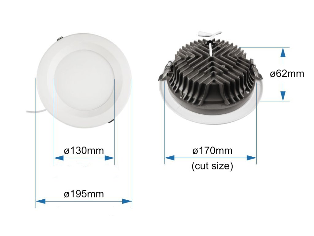 Corpul de iluminat utilizează cipuri LED moderne de tip SMD2835, care oferă o performanță stabilă, fără pâlpâire și zgomot. Dimensiunile corpului de iluminat sunt ø195 × 62 mm și pentru instalare este necesară realizarea unei găuri de montaj cu un diametru de 170 mm.