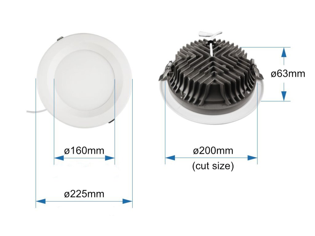 Corpul de iluminat utilizează cipuri LED moderne de tip SMD2835, care oferă o performanță stabilă, fără pâlpâire și zgomot. Dimensiunile corpului de iluminat sunt ø225 × 63 mm și pentru instalare este necesară realizarea unei găuri de montaj cu un diametru de 200 mm.