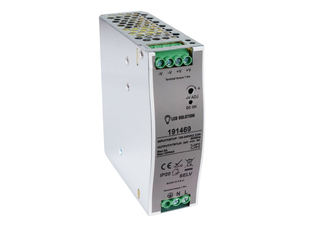 Sursă de alimentare electronică cu LED pentru benzi LED, cu cu o putere de 120W destinată utilizării în interior. Construcția permite montarea pe șină DIN direct în tabloul de distribuție. Sursa este echipată cu protecție termică, protecție la scurtcircuit și la suprasarcină și oferă posibilitatea ajustării manuale a tensiunii de ieșire în intervalul ±10%.