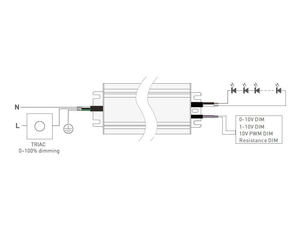 Avantajul acestei surse este posibilitatea universală de reglare, deoarece acceptă imediat mai multe moduri de reglare a intensității luminoase. Puteți controla luminozitatea cu un variator TRIAC clasic sau cu semnale de control 0–10 V, 1–10 V, 10 V PWM sau cu un rezistor în intervalul 0–100 kΩ. Acest lucru permite adaptarea ușoară la un anumit sistem și mediu în care va fi instalat iluminatul.