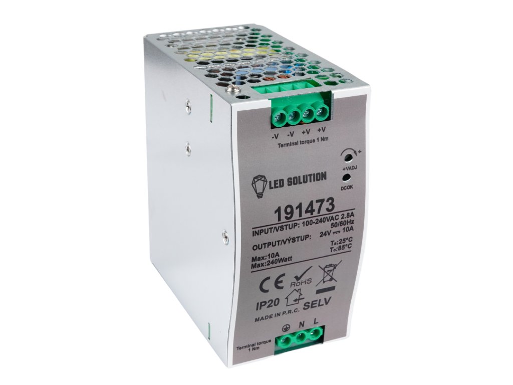 Sursă de alimentare electronică cu LED pentru benzi LED, cu putere de 240W destinată utilizării în interior. Construcția permite montarea pe șină DIN direct în tabloul de distribuție. Sursa este echipată cu protecție termică, protecție la scurtcircuit și la suprasarcină și oferă posibilitatea ajustării manuale a tensiunii de ieșire în intervalul ±10%.