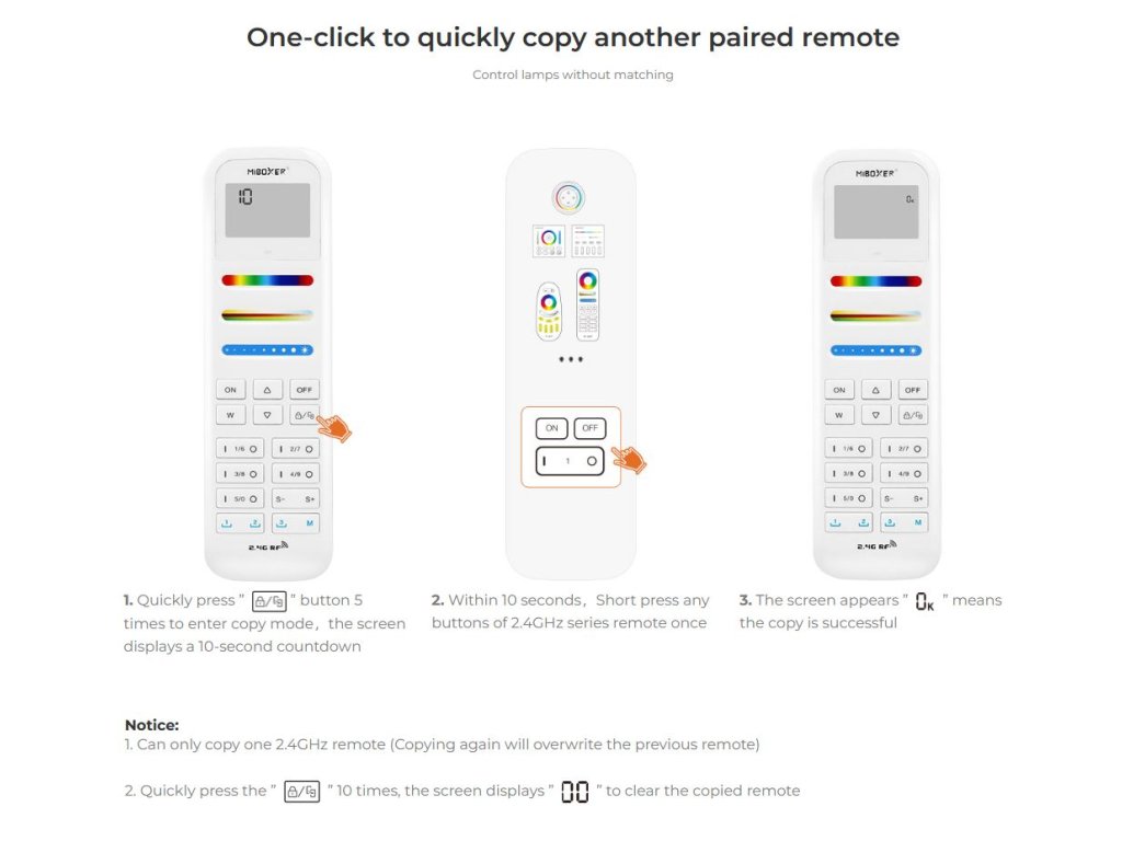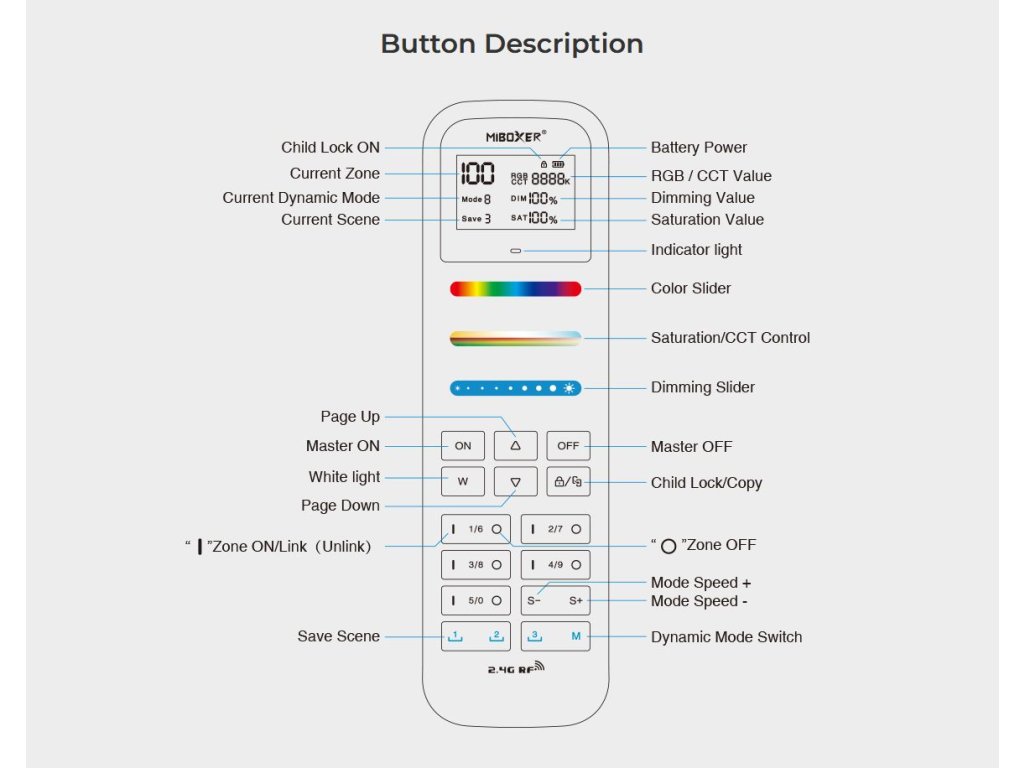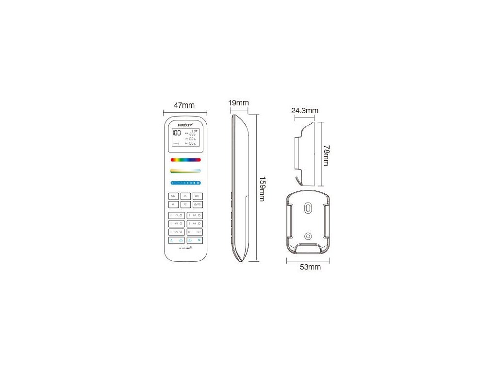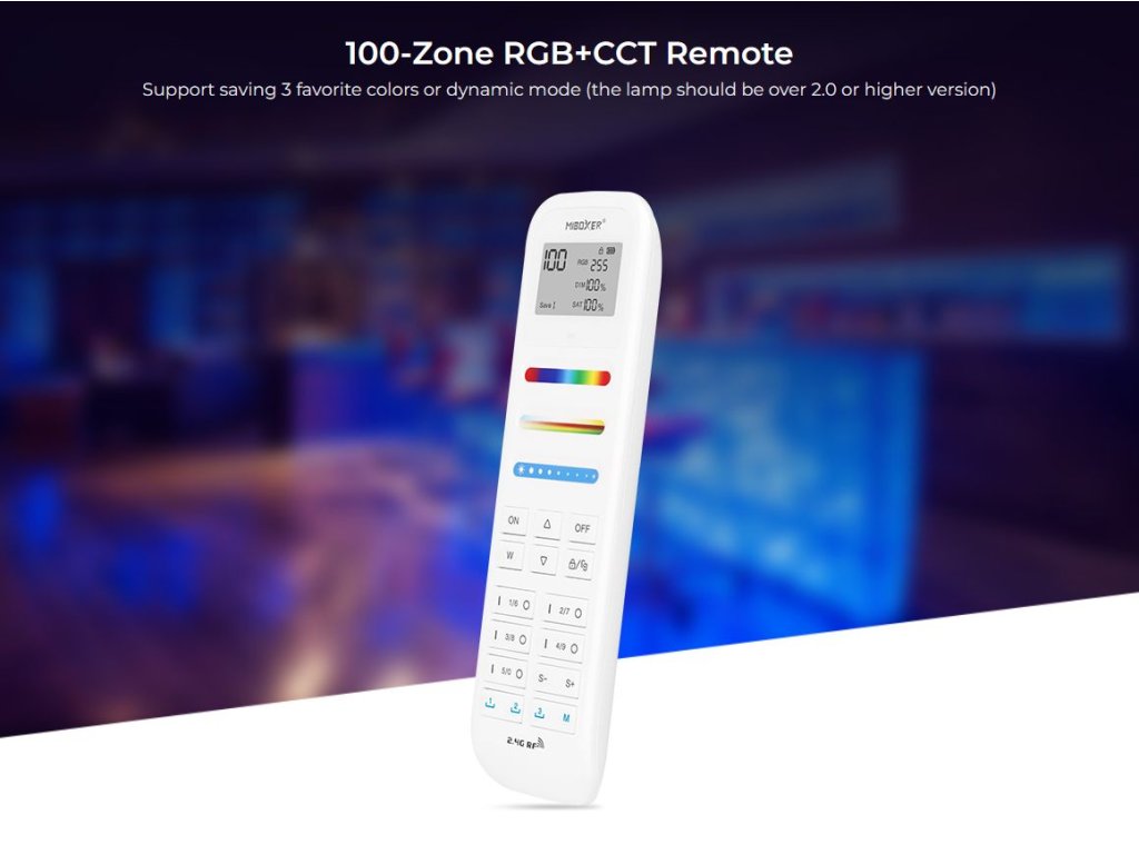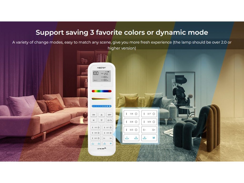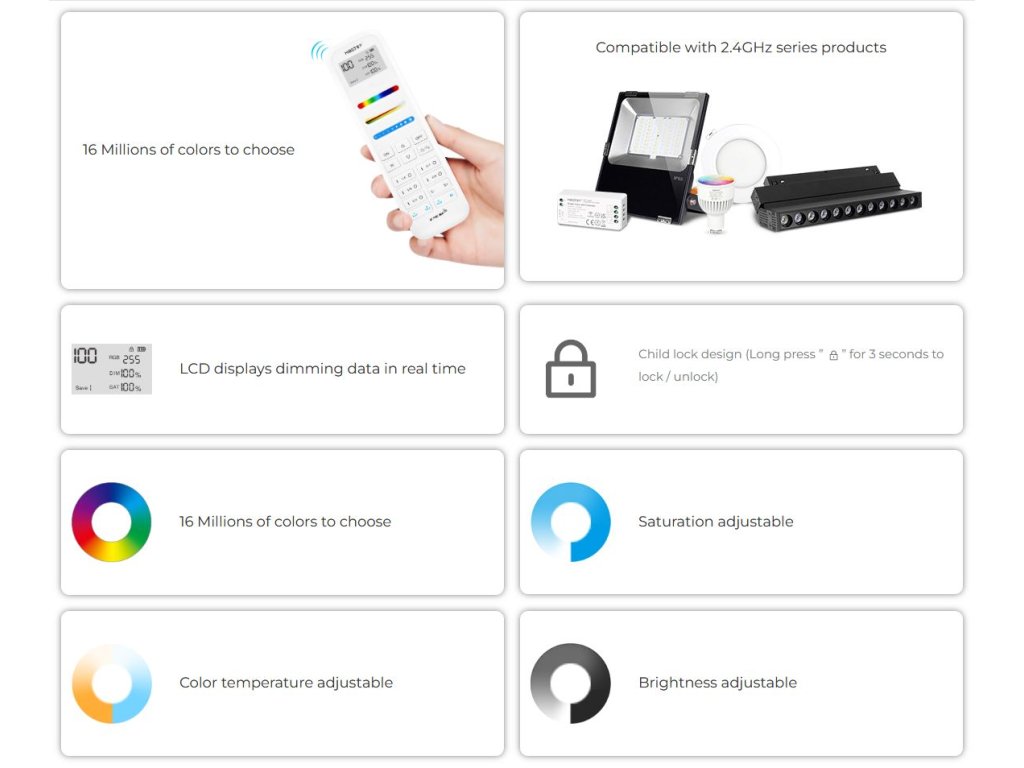 Telecomanda / dimmerul Mi-Light pentru benzi LED RGB și CCT este un sistem de control wireless cu frecvență radio pentru produsele Mi-Light / MiBoxer. Până la 100 de zone de iluminat pot fi controlate independent cu o singură telecomandă. Este necesar un receptor separat pentru fiecare zonă.