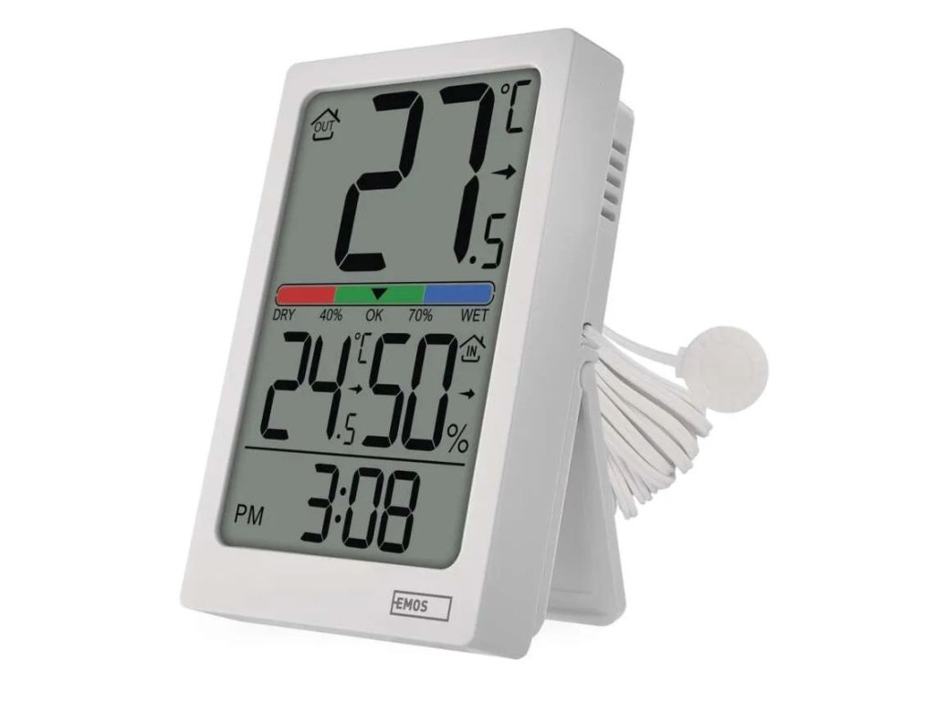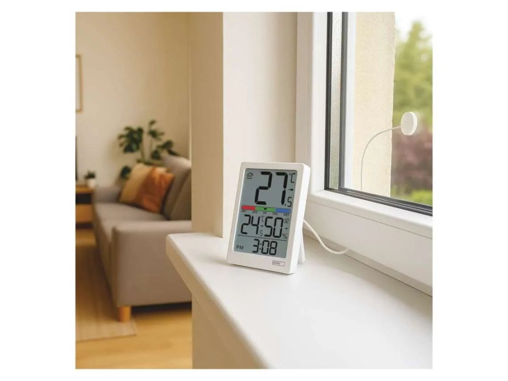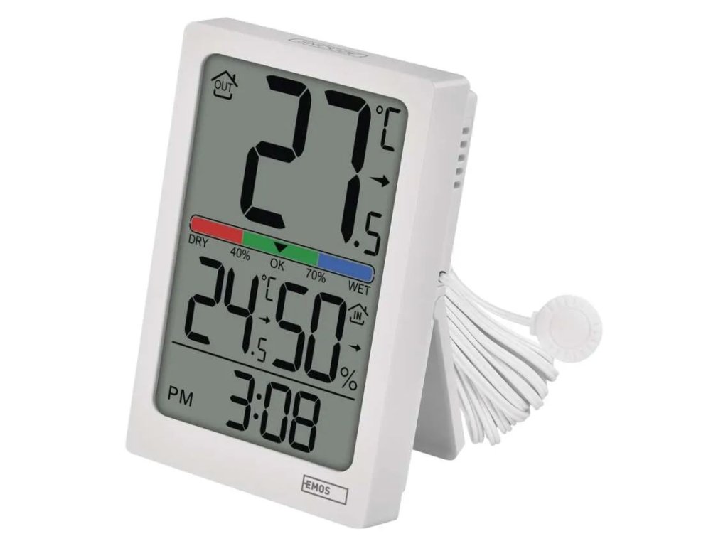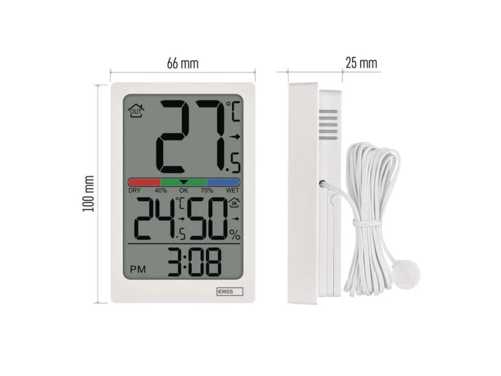 Termometrul digital E0558P cu sondă cu fir oferă o imagine de ansamblu asupra temperaturii interioare și exterioare, reprezentând o soluție simplă pentru verificarea zilnică a condițiilor din locuință. Temperatura exterioară este măsurată cu ajutorul unei sonde cu lungimea de 1,9 m, care poate fi amplasată, de exemplu, în spatele ferestrei, în timp ce unitatea principală afișează valorile actuale pe un ecran mare.